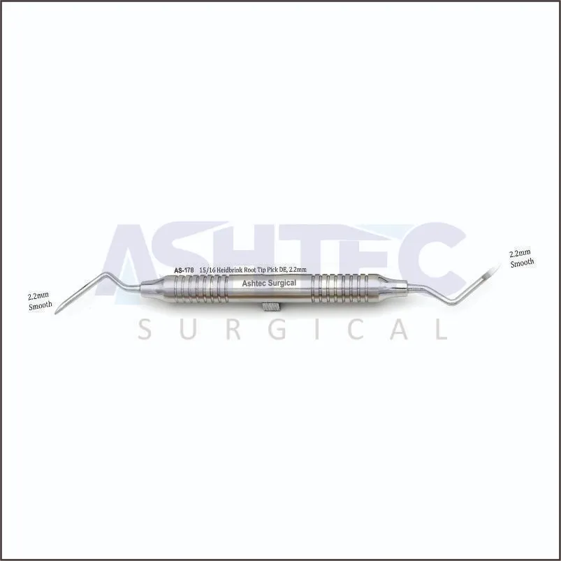 The 15/16 Heidbrink Root Tip Pick is a precision oral surgical instrument designed for the removal of fractured or retained root tips. Its double-ended (DE) 2.2 mm fine tips allow secure engagement beneath small fragments, providing controlled leverage and effective retrieval while minimizing trauma to surrounding bone and soft tissue.