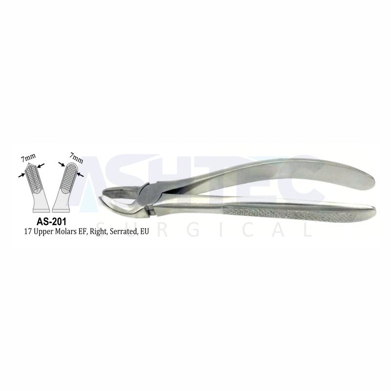 The 17 Atraumair Forceps are designed for the atraumatic extraction of maxillary right molars. Featuring end-cutting with wing (EFW) serrated beaks, these forceps provide a strong, non-slip grip on multi-rooted teeth, reducing the risk of slippage or fracture while preserving alveolar bone and gingival tissue.