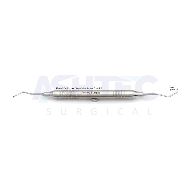170 Serrated Gingival Cord Packer, 2 mm, DE is a precision instrument designed for the effective placement and packing of retraction cord into the gingival sulcus. Featuring double-ended serrated tips measuring 2 mm, it provides secure grip and controlled adaptation of cord around the tooth margins without slippage.