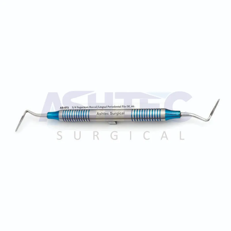 The 3/4 Sugarman Buccal/Lingual Periodontal File, DE, #6 is a precision dental instrument designed for effective scaling and root planing in periodontal therapy. Its finely curved file is specifically crafted to access buccal and lingual surfaces, allowing gentle yet thorough removal of plaque and calculus while minimizing tissue trauma.