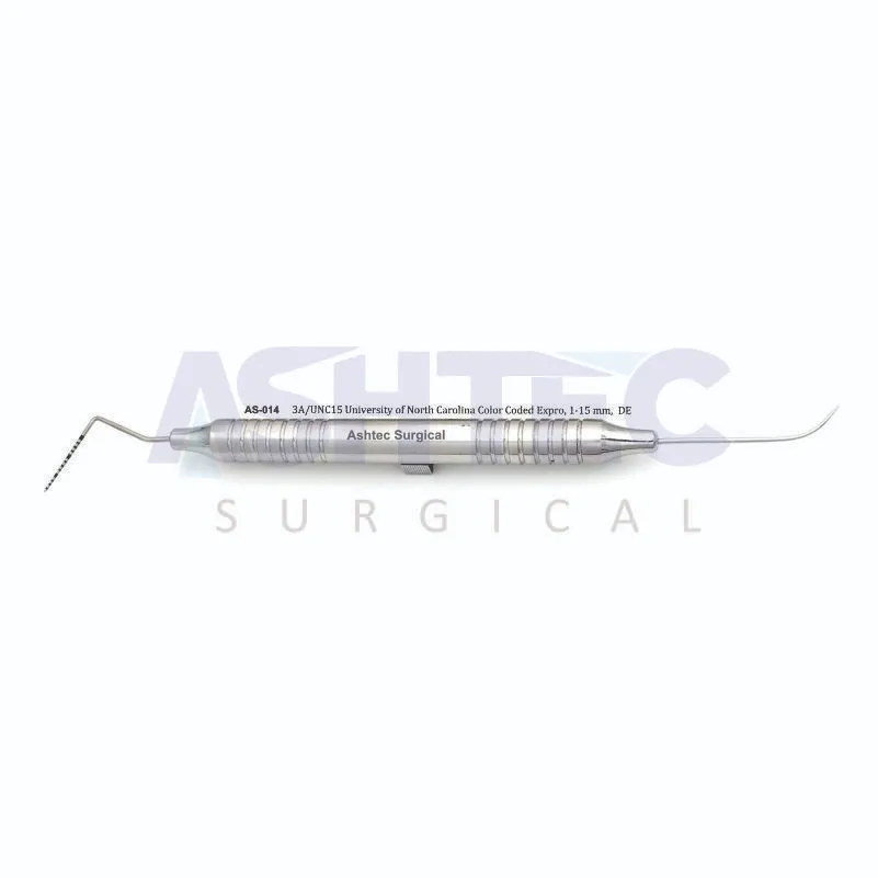 The 3A/UNC15 University of North Carolina Color Coded Expro is a precision dual-ended dental instrument that combines a 3A explorer with a UNC15 periodontal probe. The 3A explorer is designed for accurate detection of caries, calculus deposits, and enamel irregularities, while the UNC15 probe features color-coded markings at 1–15 mm for reliable periodontal pocket depth measurement.
