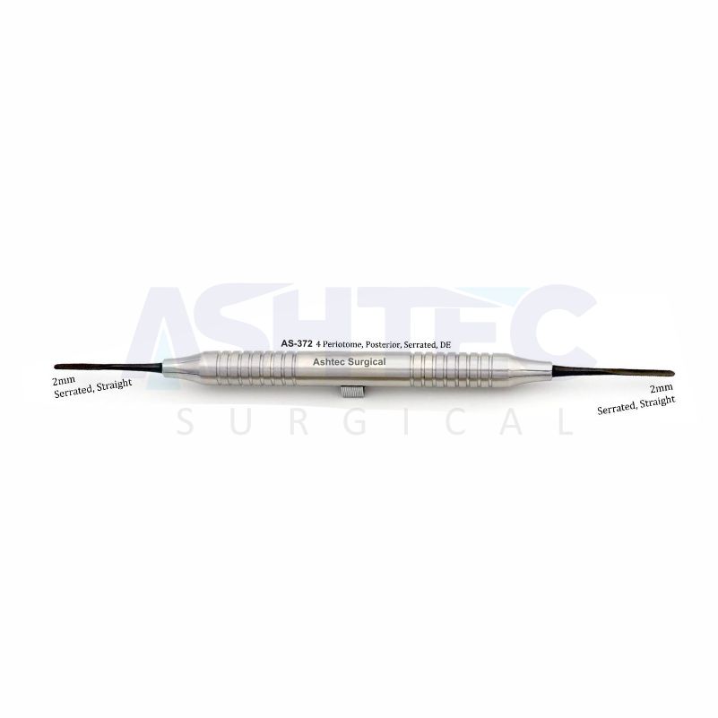 The 4 Periotorne, Posterior, Serrated, DE is a specialized dental extraction instrument designed to facilitate atraumatic luxation and mobilization of posterior teeth. Its double-ended (DE) configuration features two working tips, each finely serrated to ensure a secure grip and controlled force application during extractions.
