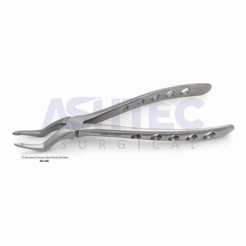 The 51 Atraumatic Forceps are specially crafted for the precise extraction of maxillary root fragments. Featuring serrated, slim beaks, they ensure a secure grip on fragile root structures, minimizing the risk of slippage and breakage during extraction. The serrated design enhances control while preserving surrounding alveolar bone and soft tissues, making them ideal for delicate surgical procedures.