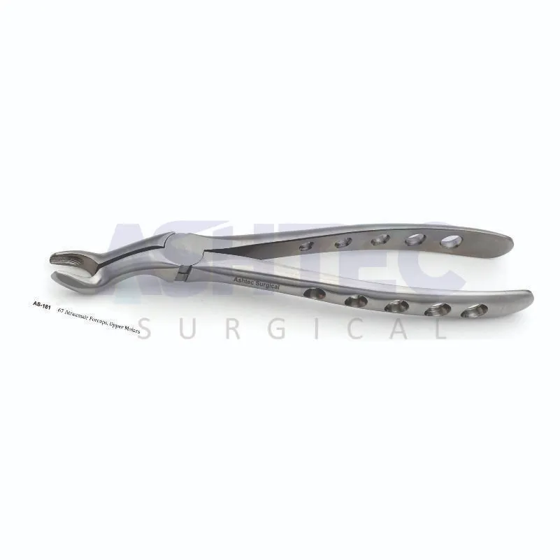 The 67 Atraumatic Forceps are specialized extraction forceps designed for the atraumatic removal of upper molars. Their uniquely shaped beaks are contoured to fit securely around the crown and root structure, providing excellent grip and controlled force during extractions while minimizing the risk of fracturing roots or damaging surrounding bone.