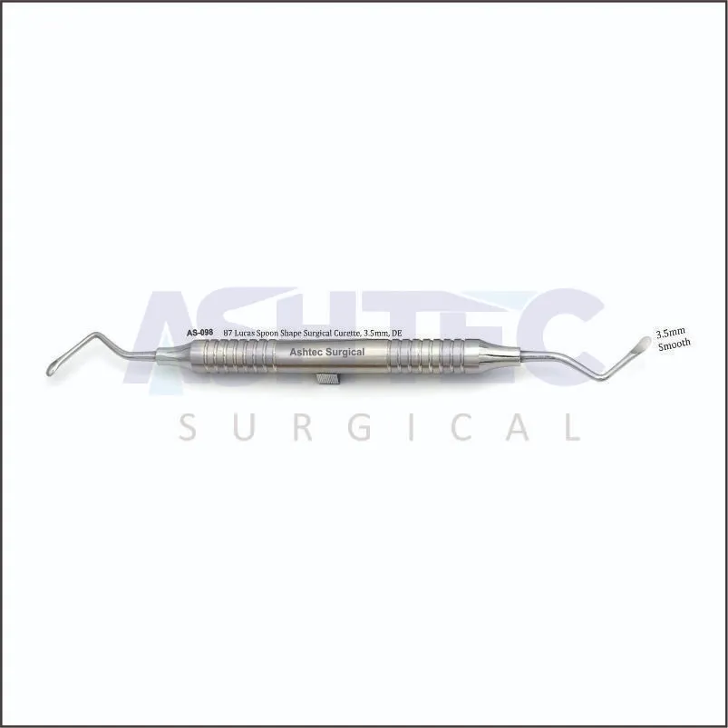 The Lucas Surgical Curette is a specialized dental instrument used for curettage, debridement, and removal of cysts or granulation tissue in periodontal and oral surgical procedures. Its spoon-shaped, double-ended (DE) 3.5 mm working ends provide precision in small or narrow areas, allowing controlled scraping and scooping of soft tissue from bony cavities.