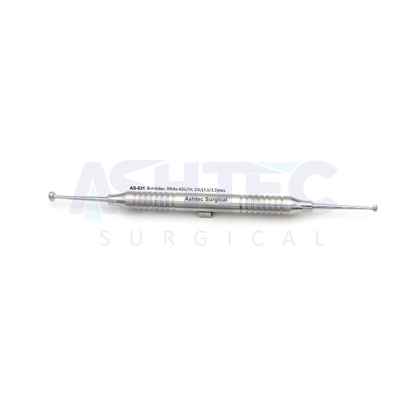 Burnisher, White #26/29, 2.0/5.5/3.5 mm is a versatile, double-ended instrument designed for contouring, polishing, and adapting restorative materials to cavity walls and margins. With three working tip diameters (2.0 mm, 5.5 mm, and 3.5 mm) incorporated across its ends, it offers a wide range of applications for both small detail work and broader surface finishing.