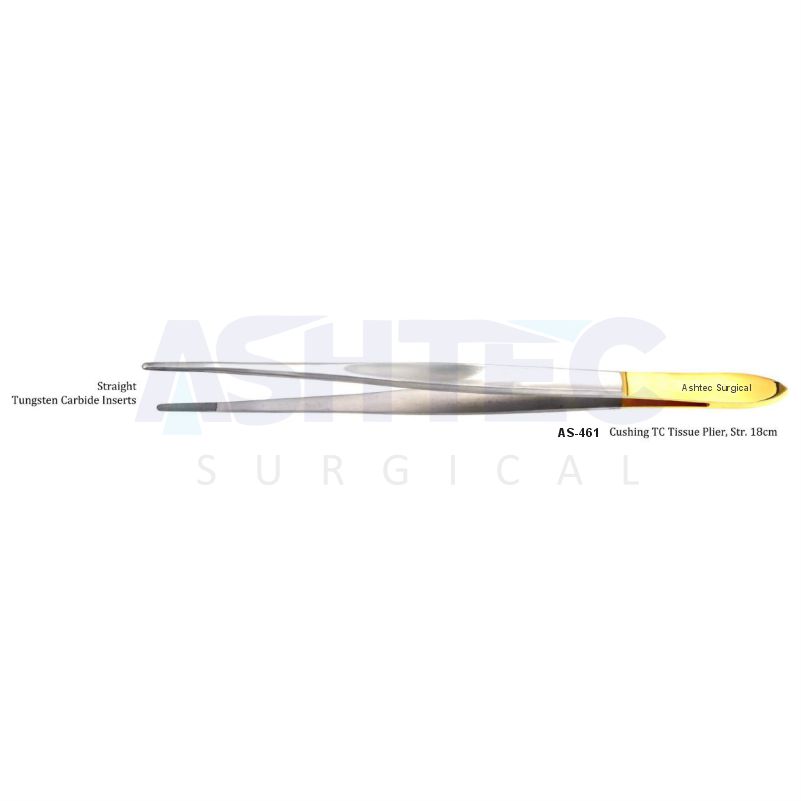 The Cushing TC Tissue Plier, Str. (18cm), is a precision instrument designed for meticulous tissue handling in microsurgical procedures. Featuring straight jaws with Tungsten Carbide (TC) inserts, this plier provides an exceptional grip and superior control, ensuring minimal tissue trauma during delicate surgical tasks. Its straight design is ideal for general tissue manipulation and precise dissection, especially in microsurgery where accuracy is paramount.
