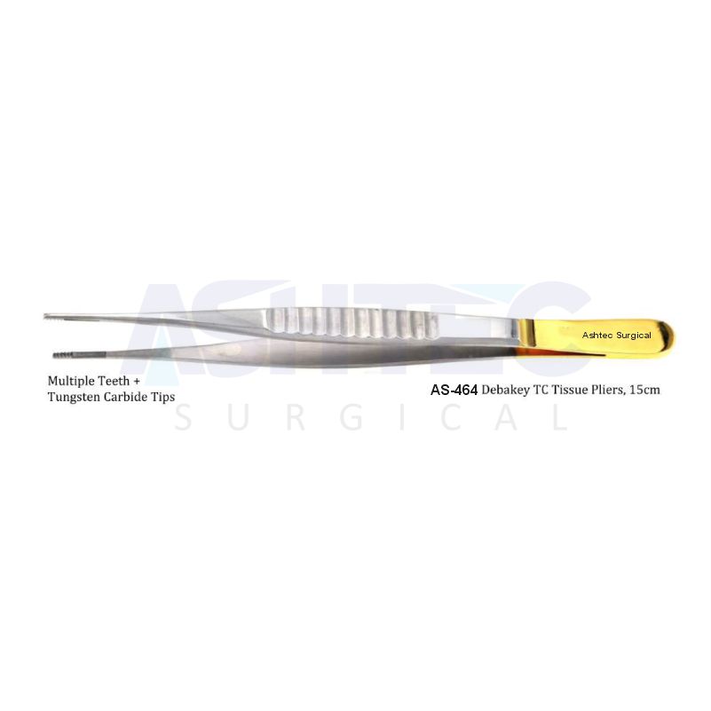 The Debakey TC Tissue Pliers, 15cm, are precision-crafted surgical instruments designed for delicate tissue manipulation with superior control and minimal trauma. Featuring Tungsten Carbide (TC) inserts on the jaws, these pliers provide a secure, non-slip grip, ensuring precise handling of soft tissues during dissection, retraction, or suturing. The Debakey design, known for its fine serration, allows for effective tissue grasping without causing unnecessary damage.