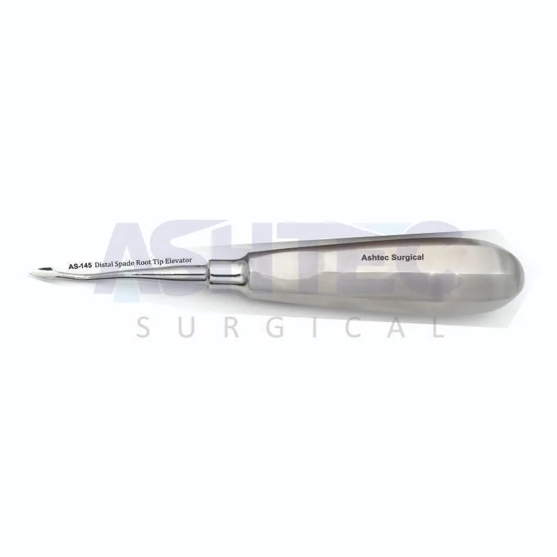 The Distal Spade Root Tip Elevator is a specialized oral surgical instrument designed for the safe elevation and extraction of fractured or retained root tips. Its spade-shaped working end with a distal angulation provides secure engagement under the root surface, allowing controlled leverage and elevation while minimizing damage to surrounding bone and tissue.