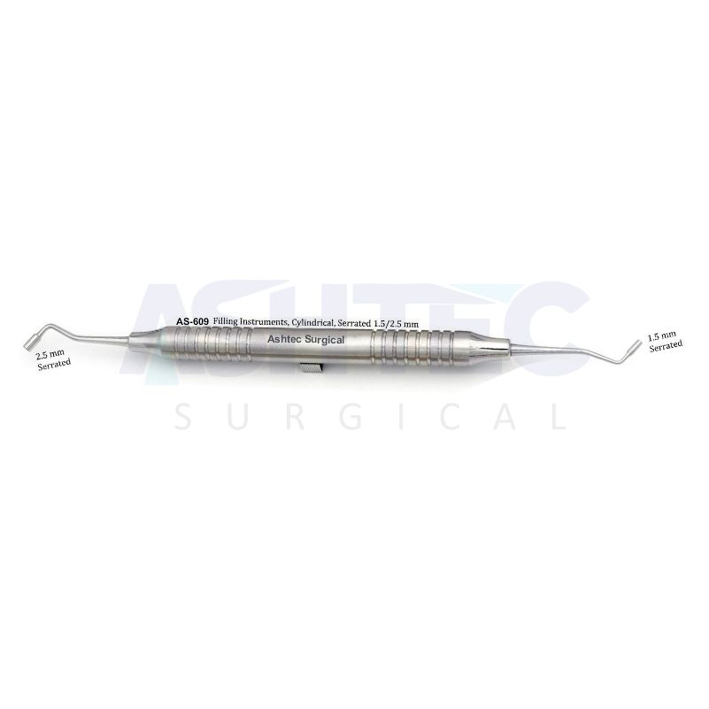 Filling Instruments, Cylindrical, Serrated 1.5/2.5 mm are designed for accurate placement, packing, and adaptation of restorative materials in dental cavities. Featuring a double-ended cylindrical design with tips of 1.5 mm and 2.5 mm, this instrument provides versatility for both narrow and wider cavity preparations.