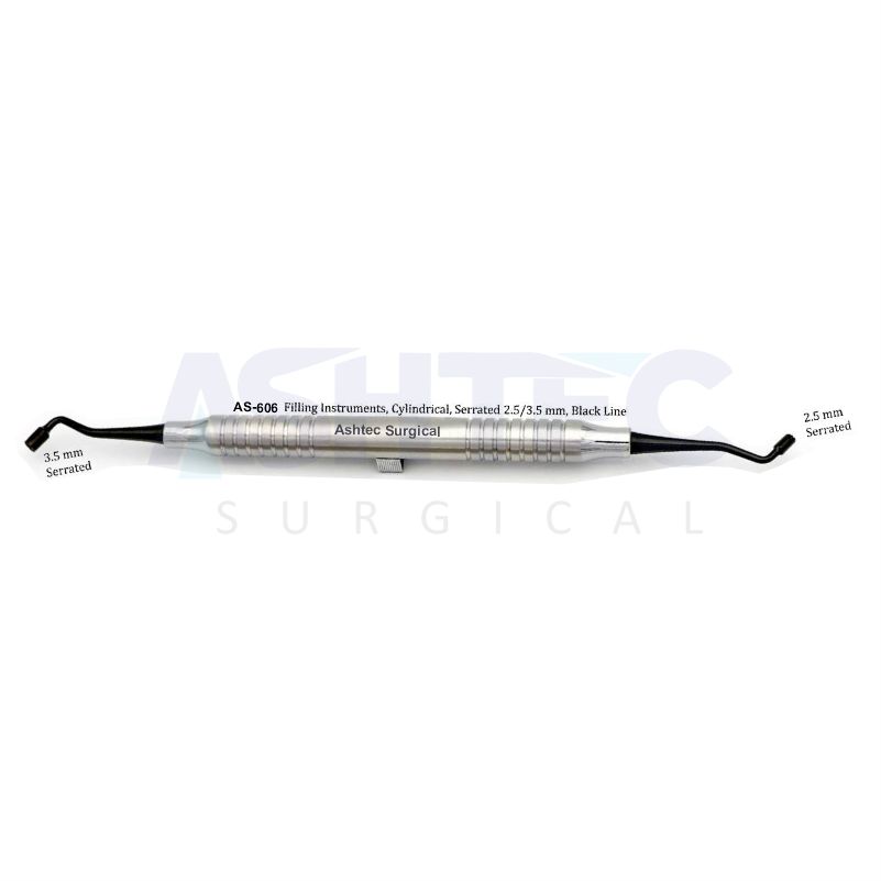 The Filling Instrument, Cylindrical, Serrated 2.5/3.5 mm, Black Line, is specially designed for the precise placement, condensation, and shaping of restorative materials. Featuring dual cylindrical working ends—2.5 mm and 3.5 mm—it provides versatility for handling both small and medium restorations.