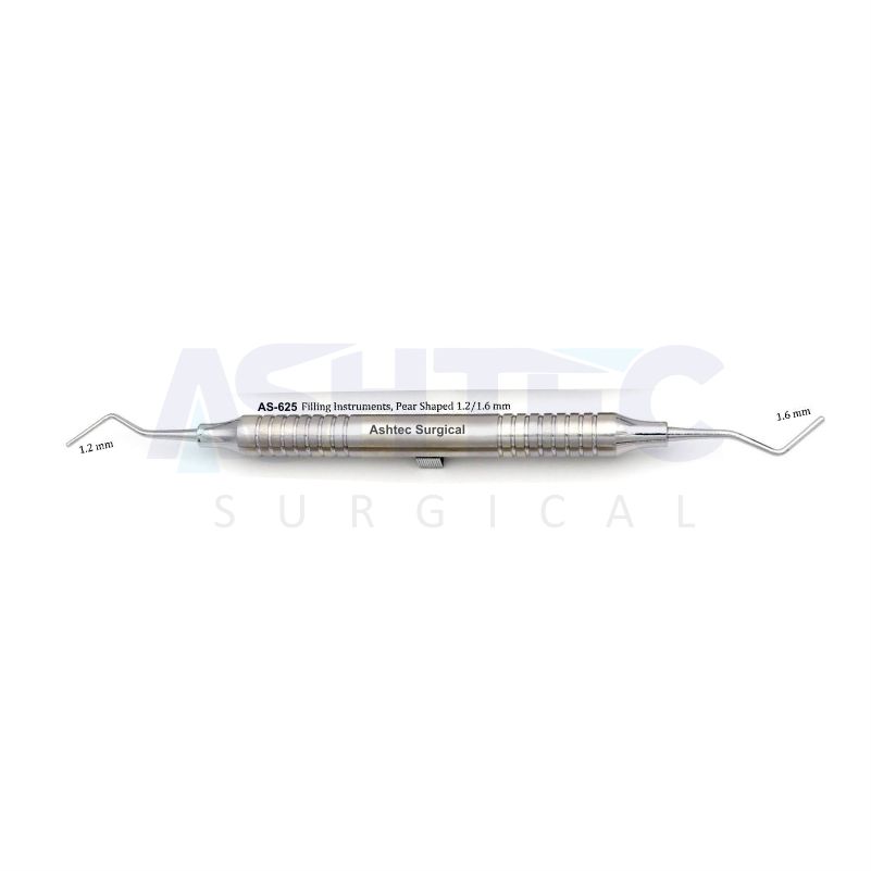 Filling Instruments, Pear Shaped 1.2 mm/1.6 mm are designed for highly precise placement, shaping, and condensation of restorative materials in small and narrow cavity preparations. With double-ended pear-shaped tips of 1.2 mm and 1.6 mm, this instrument is ideal for fine restorative work requiring maximum accuracy and control.