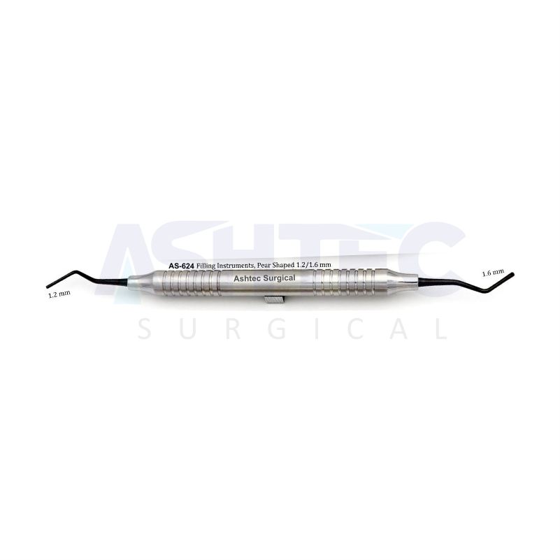 Filling Instruments, Pear Shaped 1.2 mm/1.6 mm are designed for highly precise placement, shaping, and condensation of restorative materials in small and narrow cavity preparations. With double-ended pear-shaped tips of 1.2 mm and 1.6 mm, this instrument is ideal for fine restorative work requiring maximum accuracy and control.