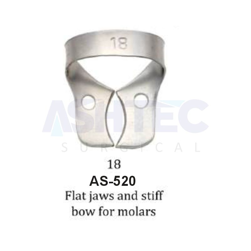 The Rubber Dam Clamp 18 is specially designed for the isolation of molars during restorative and endodontic procedures. Featuring flat jaws and a stiff bow, this clamp provides a strong, secure grip on molar teeth while ensuring optimal rubber dam retention. The stiff bow maintains constant pressure, allowing for easy placement and minimal slippage during procedures, even in challenging molar anatomies.