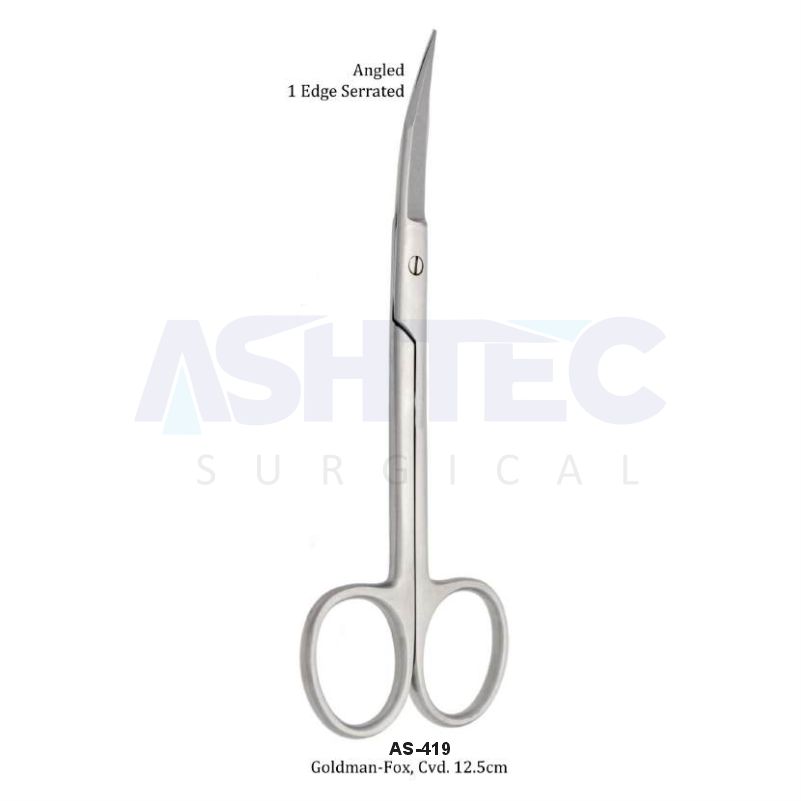 Goldman-Fox Scissors, curved and angled, 12.5cm with one serrated edge, designed for precision, control, and durability in periodontal and surgical procedures.