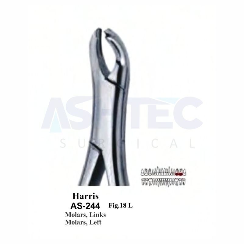 The Harris Molar (Left) Forceps are specifically designed for the extraction of maxillary left molars, providing strength, precision, and control in both routine and complex extractions. The anatomically contoured beaks are shaped to adapt closely to the morphology of upper left multi-rooted molars, ensuring a firm and stable grip during removal.