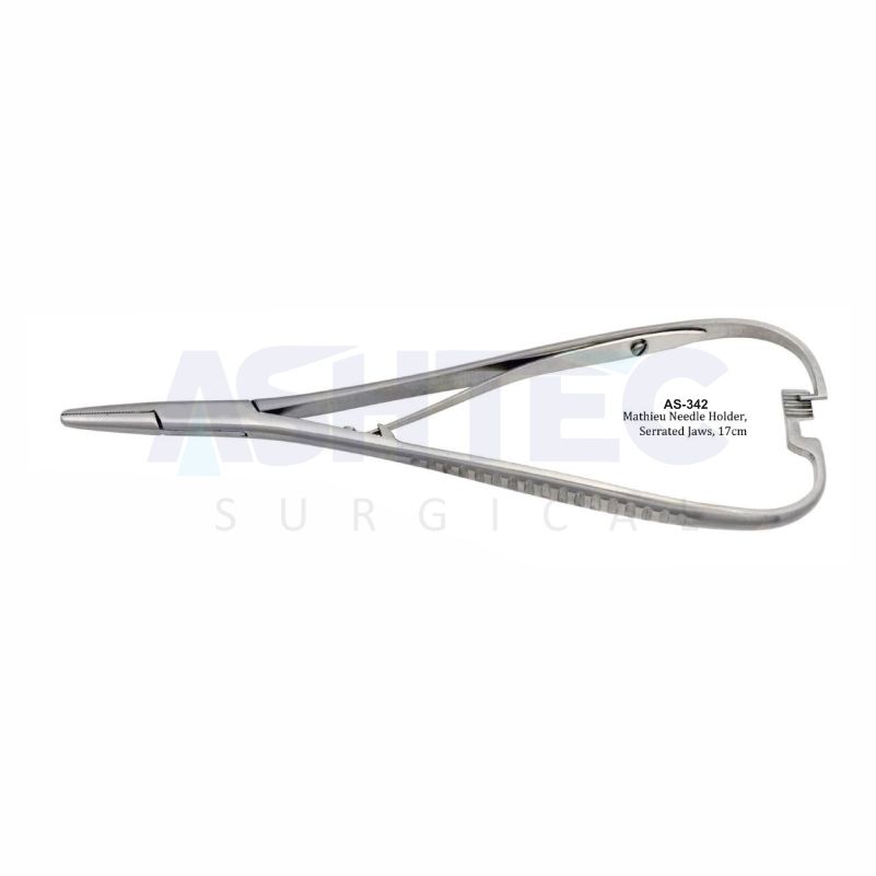 The Mathieu Needle Holder, 17cm is a versatile surgical instrument designed for secure handling of suture needles in dental, periodontal, and general surgical procedures. Its serrated jaws provide a firm, non-slip grip, ensuring accurate control of the needle and minimizing the risk of slippage during suturing.