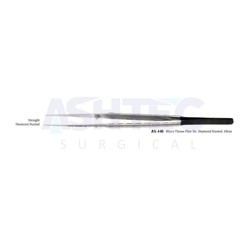 The Micro Tissue Plier, Str. Diamond Dusted (18cm), is a precision instrument designed for the meticulous handling of delicate tissues in microsurgical procedures. Featuring diamond-dusted serrated jaws, it provides an excellent grip on soft tissue while minimizing the risk of damage or tearing. The fine serration ensures a secure hold, making it ideal for tasks that require high accuracy and minimal trauma to surrounding structures.