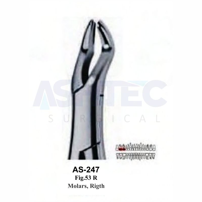 The Right Molar Forceps are designed for the extraction of maxillary right molars, offering strength, precision, and reliability. The anatomically contoured beaks adapt securely to the morphology of upper right multi-rooted molars, ensuring a firm, stable grip for efficient and controlled extractions.