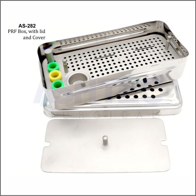 The PRF Box with Lid and Cover is a specialized instrument used for the preparation, handling, and storage of Platelet-Rich Fibrin (PRF) membranes in oral, implant, and regenerative surgical procedures. It is designed to compress PRF clots into thin membranes while preserving cell vitality and growth factor release.