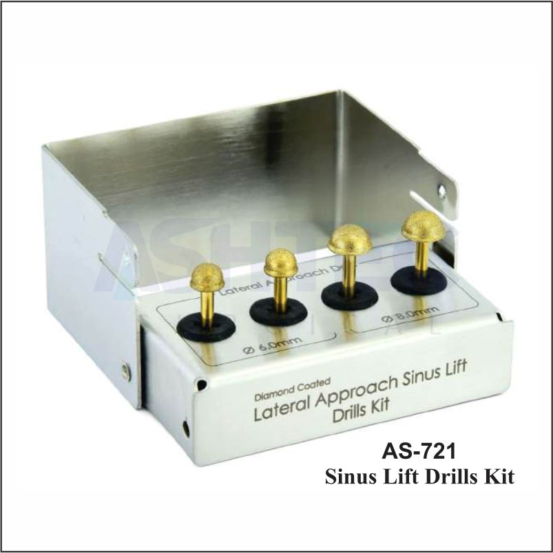 Sinus Lift Drills Kit is a specialized surgical set designed for precise and controlled lateral or crestal sinus lift procedures. The kit includes a selection of depth-controlled drills, stops, and hand instruments that allow clinicians to safely access the maxillary sinus and elevate the membrane while minimizing the risk of perforation.