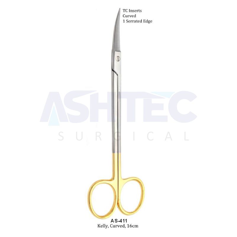 TC Kelly Scissors, curved, 16cm with one serrated edge, provide durability, precision, and controlled cutting for surgical and clinical procedures.