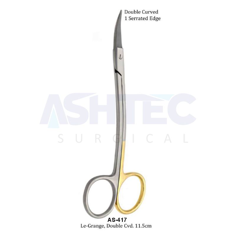The TC Le-Grange Scissors are specialized surgical scissors designed for precision cutting in confined or hard-to-reach areas. Featuring a double-curved design (both shank and blades) and a compact 11.5cm length, these scissors provide excellent visibility and access, making them ideal for periodontal, dental, and delicate surgical applications.